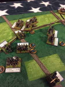 At the begining of turn four another southern brigade enters the board. By this time the union have moved up the rear most brigade but it is evenly match. Eight federal regiments agains 5 rebel regiments of infantry and 1 rebel cavalry regiment.